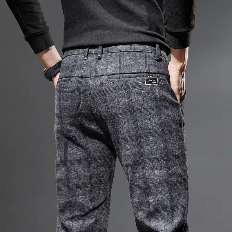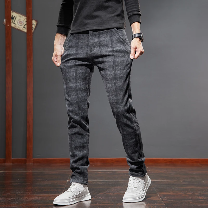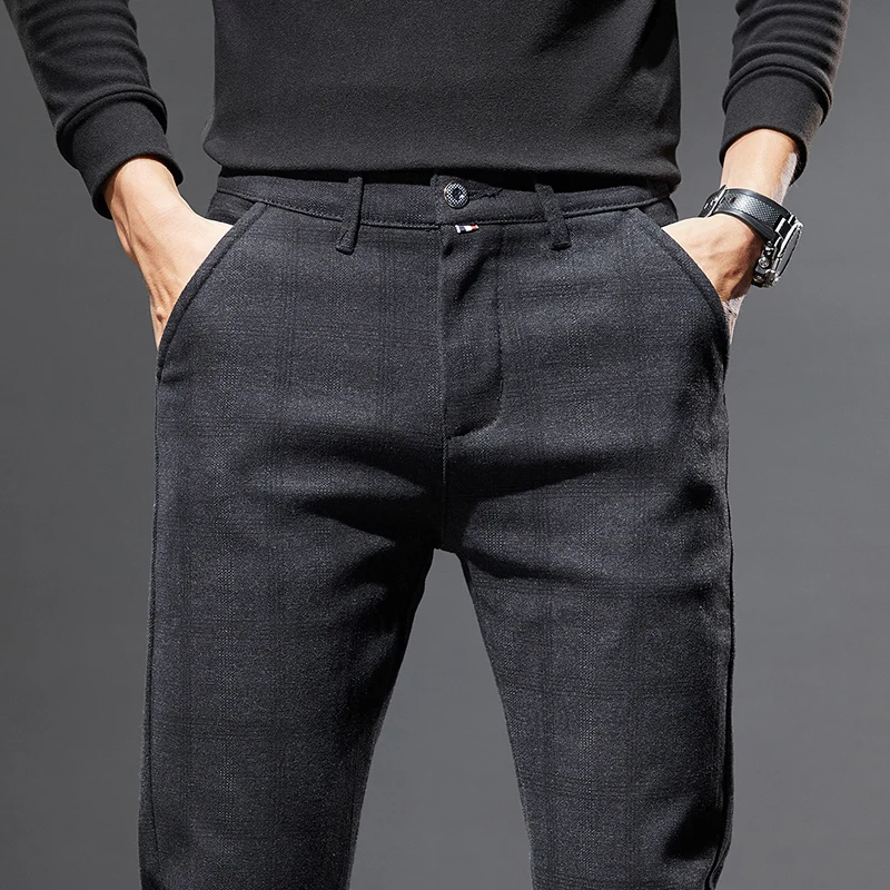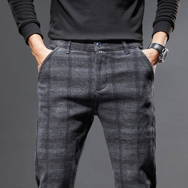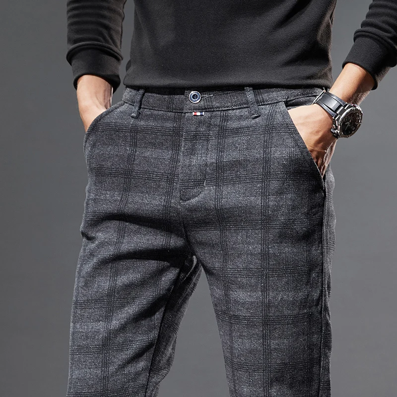 Classic Style Men's Fleece Casual Pants Fashion Striped Plaid Business Straight Slim Casual Pants Black Gray Brand Men Trousers
