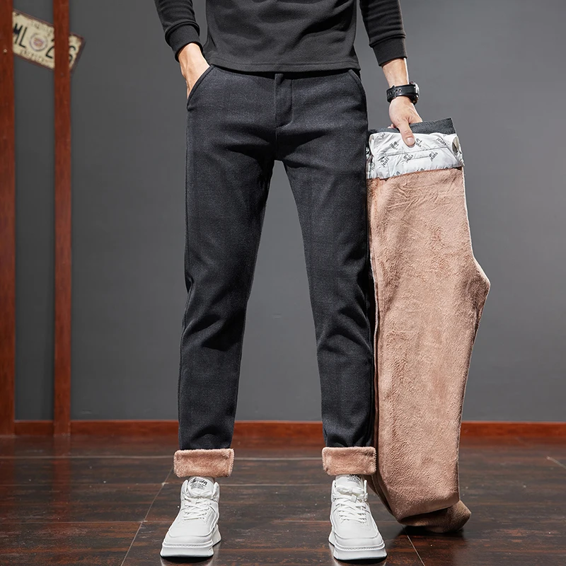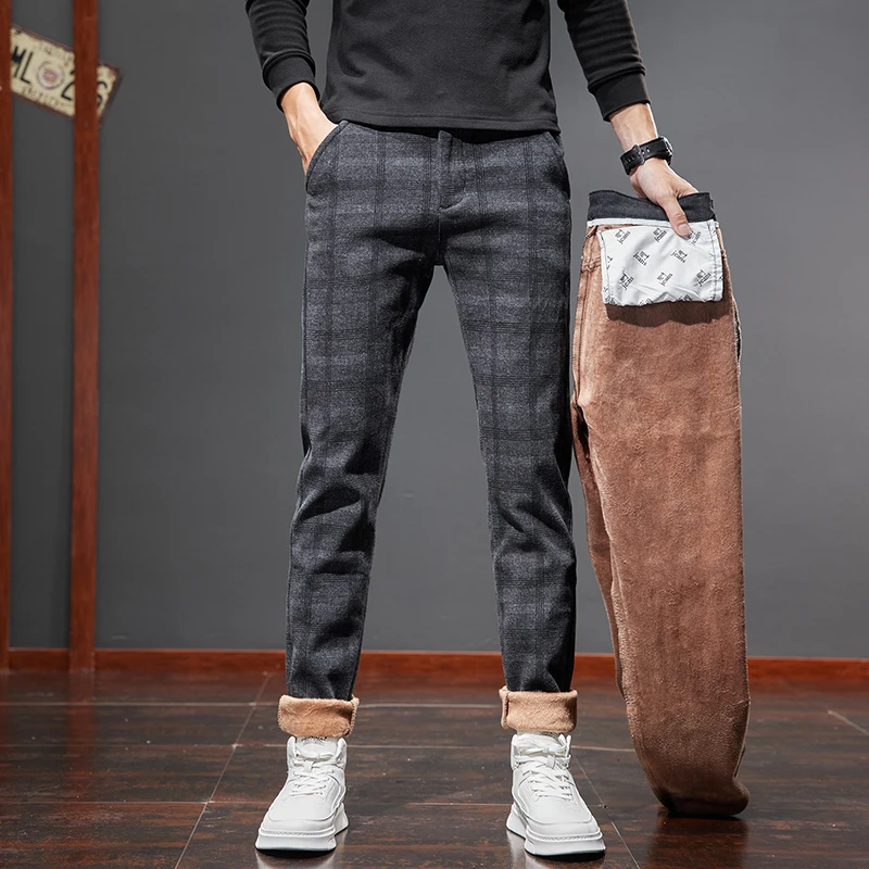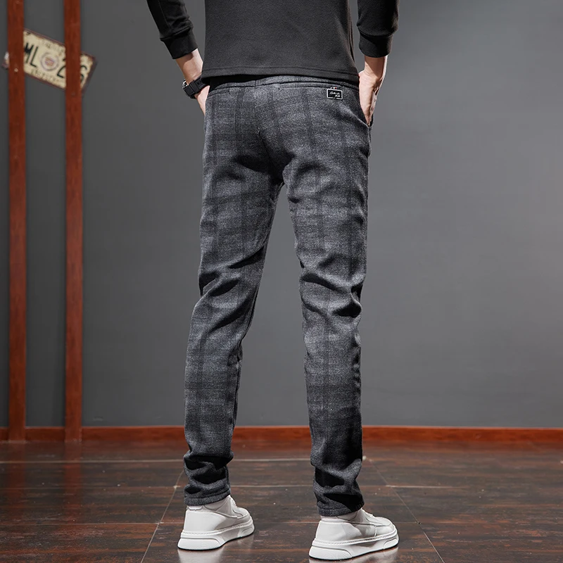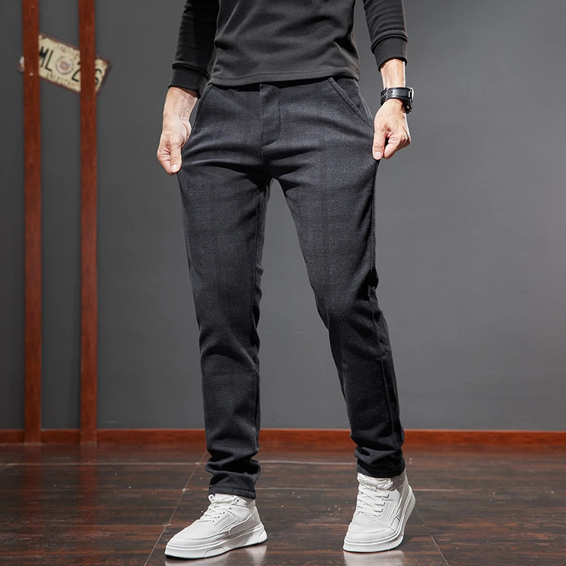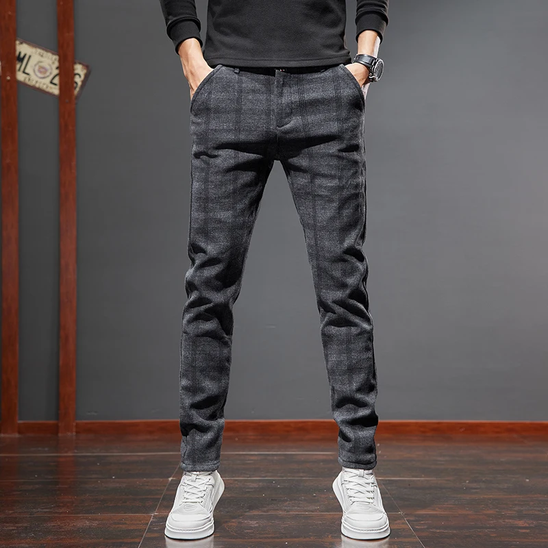 Classic Style Men's Fleece Casual Pants Fashion Striped Plaid Business Straight Slim Casual Pants Black Gray Brand Men Trousers